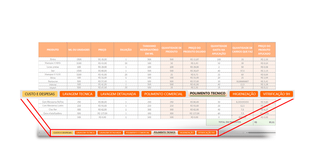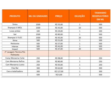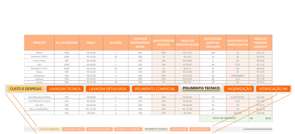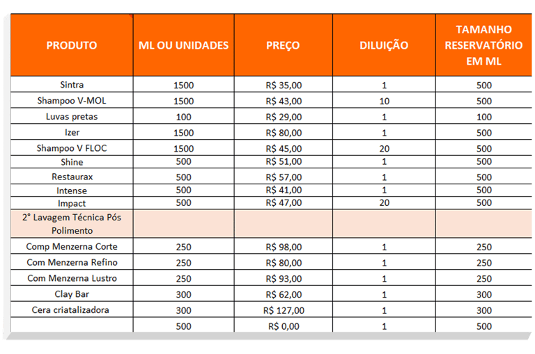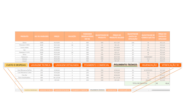 ✅ Insumos Pré-Configurados: Lavagem, Polimento e Vitrificação com gastos de produtos (Sintra, V-Mol, Izer) já calculados por nós.