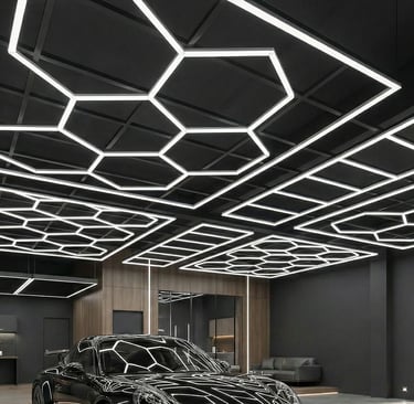 Iluminação de Trabalho (Ambiente): São as luzes que garantem que você enxergue o carro como um todo. Elas devem ser difusas para evitar sombras excessivas e fadiga ocular. As famosas luzes hexagonais (Hexagon Lights) são excelentes para isso, pois preenchem o ambiente e criam reflexos lineares que ajudam a identificar amassados e vincos.
