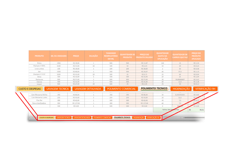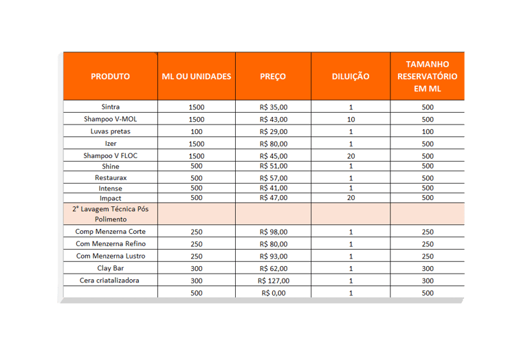 ✅ Insumos Pré-Configurados: Lavagem, Polimento e Vitrificação com gastos de produtos (Sintra, V-Mol, Izer) já calculados por nós.